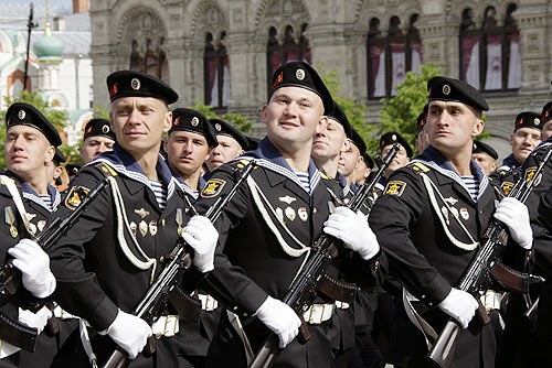 Infantes de marina soviética de gala constituidos de saco negro y telnyashka.